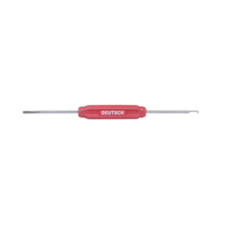 The DEUTSCH Multi-Use Removal Tool has a small hook on one end for wedgelock removal, and a small screwdriver on the other end for contact removal, pushing back the locking fingers to release the contact.