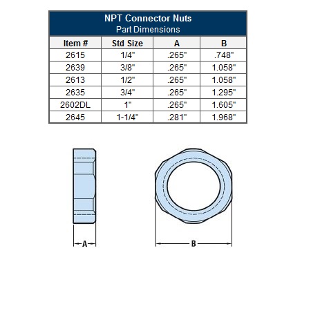 This NPT strain relief cord connector nut is required for use on STD NPT strain relief cord connectors. This locking nut completes the connection of a STD NPT cord connector to a power cord, providing a liquid-tight seal that prevents moisture or any other damaging liquid from ruining the power cord connection.